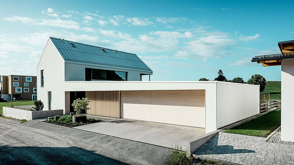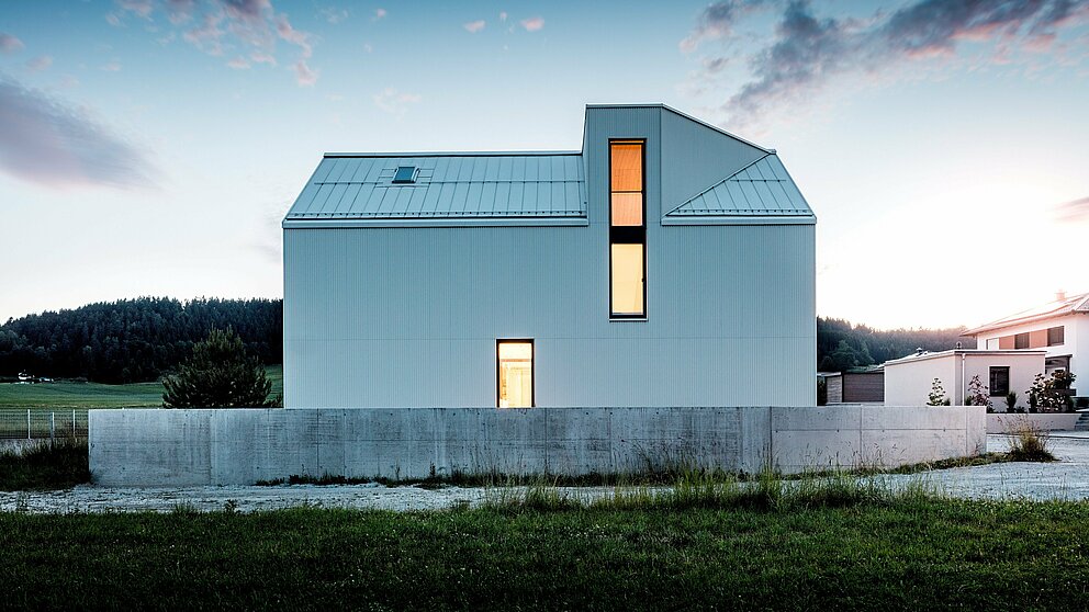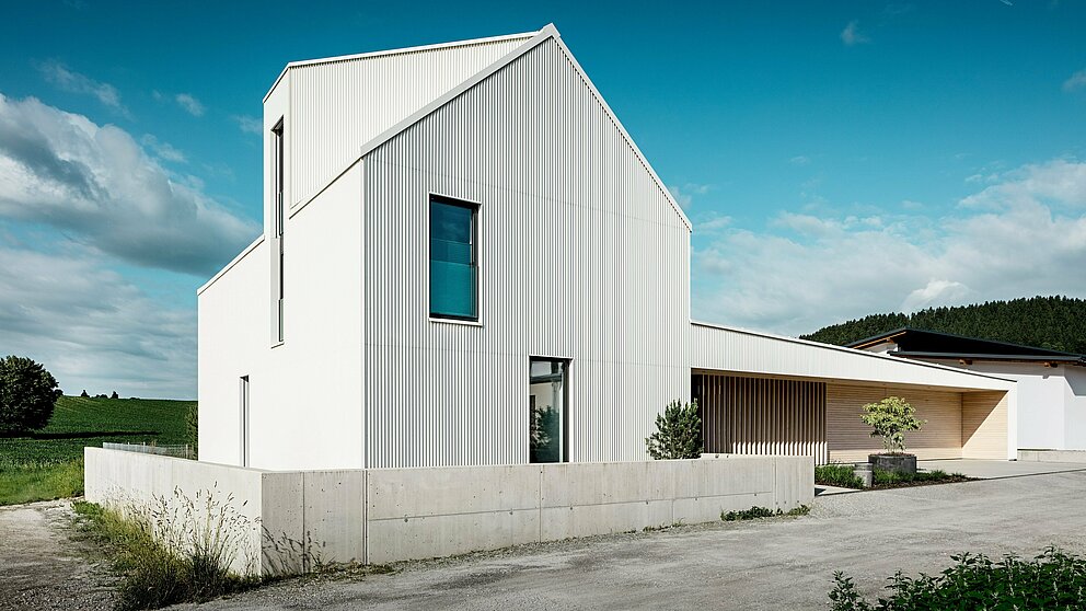 „Méně je více,“ věděl už Mies van der Rohe. Ale za zdánlivou jednoduchostí se často skrývá konstrukční složitost. Při důsledné jednobarevnosti je základním předpokladem pro vizuální stálost budovy barevná stabilita. Z toho důvodu se architekti již od počátku rozhodli pro odvětrávanou čistě bílou fasádu ze svitkového plechu PREFALZ – rafinovaně nepravidelně zvrásněného, aby tak domu dodali moderní eleganci.
