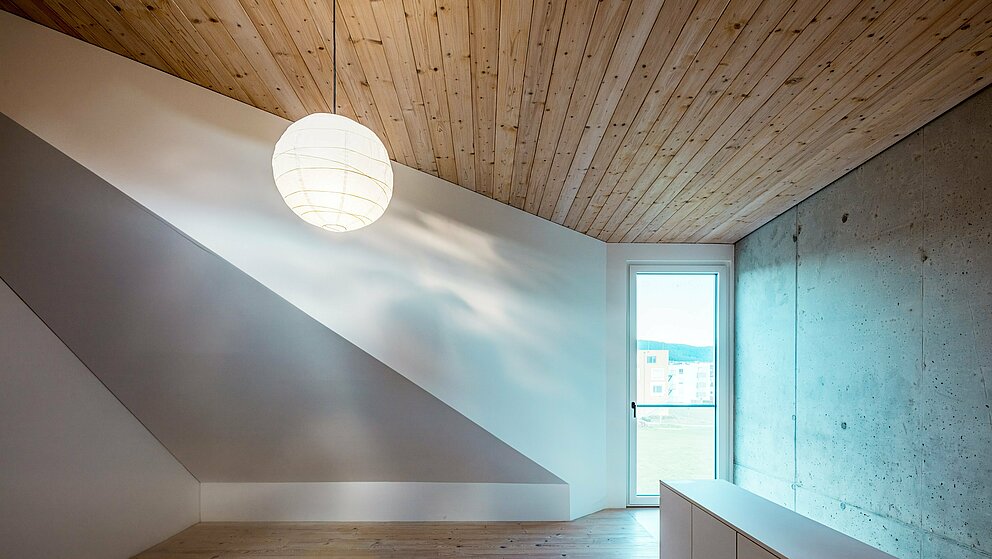 Svou monolitickou formou a jednobarevnou bílou fasádou ztělesňuje nápadný nárožní dům purismus v podobě perfektní geometrie. Dvě tělesa budovy – jedno s plochou střechou, druhé s šikmou střechou – se na sebe napojují ve tvaru L a tvoří chráněný vnitřní dvůr se zastřešenou terasou. Žádné klasické přesahy střechy, zato zdůrazněné ukončovací hrany na štítech, okrajích střechy a atice. Uvnitř se některé místnosti otevírají až do střechy a promyšleně umístěná okna nechávají zrak bloudit do dálky. Velké vikýřové okno působivě osvětluje hloubku prostor. Podlahy z leštěného betonu, dřevěné obklady ze světlé jedle bělokoré a bíle lazurované dřevo dodávají interiéru elementární srozumitelnost a vytvářejí oázu klidu.