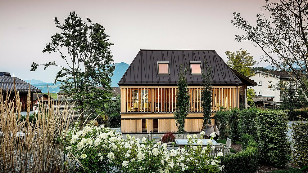 Také pod ikonickou valbovou střechou pojalo studio NONA staré stavební tradice nově: místo dřevěných šindelů typických pro region Bregenzského lesa zdůraznily architektky fasádu vertikálními dřevěnými lamelami po celé výšce patra, které lze manuálně nastavovat mechanickým systémem. I uvnitř „lázeňského domu“ dominuje na třech výškových úrovních dřevo v estetickém minimalistickém designu. Celkový koncept dotváří otevřeně pojednaný venkovní prostor s bazénem, bez plotů i vegetačních bariér.