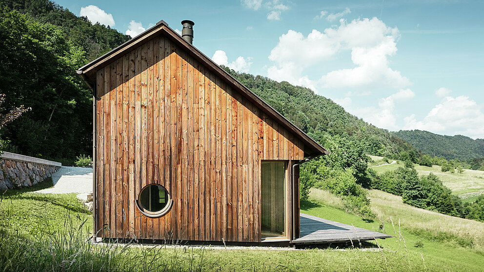 Jasné zaměření na to, co je podstatné, se neodráží pouze v architektonickém konceptu, ale také ve výběru materiálu. Dřevěná fasáda, která časem vybledne do decentně šedého tónu, perfektně ladí s teplou hnědí hliníkové střechy s pásy PREFALZ. Oba materiály se harmonicky propojují s krajinou a podtrhují architektonický minimalismus. Jak Blaž Kandus vysvětluje, je u projektů jeho studia rozhodující měřítko. Odkazuje se jak na lidské měřítko, tak na měřítko okolí – v případě objektu ve Vinje je jím krajina.