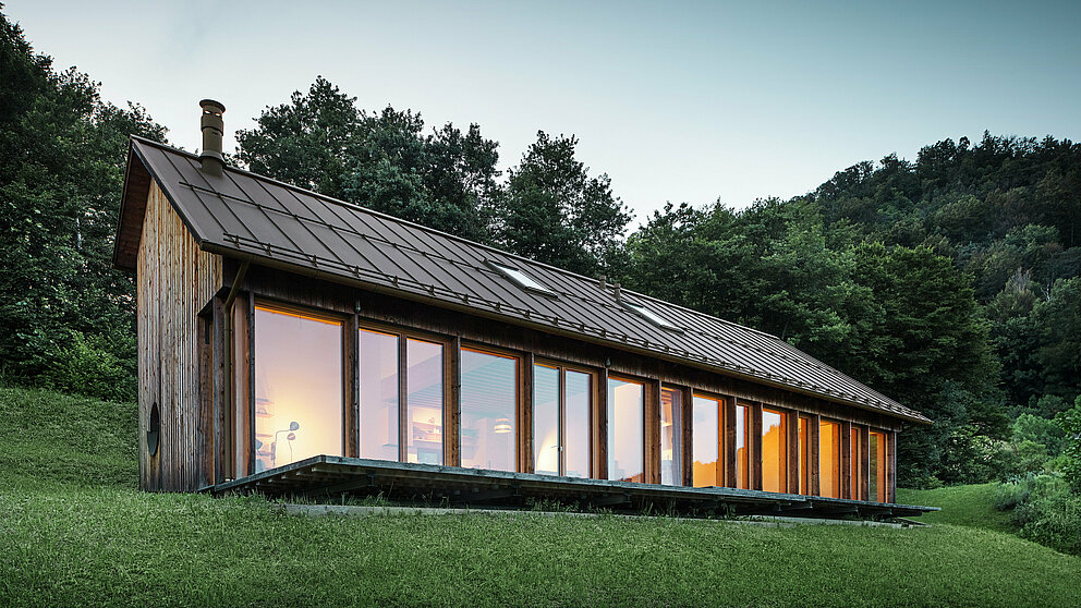 „Materiál a barva vyzařují teplo. Architekti dům skvěle začlenili do krajiny,“ hodnotí Kralj několika málo slovy stavbu a přidává ještě tip pro udržitelnost: „Myslím, že mimořádný potenciál spočívá v použití příhodného solárního panelu PREFALZ.“ Přitom by sice podle něho bylo nutné použít výhradně standardizované šíře pásů PREFALZ, ale to je přesně to správné řešení pro budoucí možnost realizace energeticky nezávislých budov.