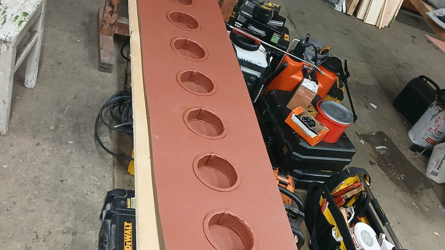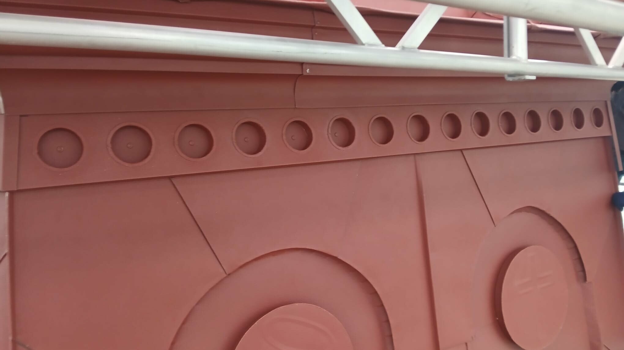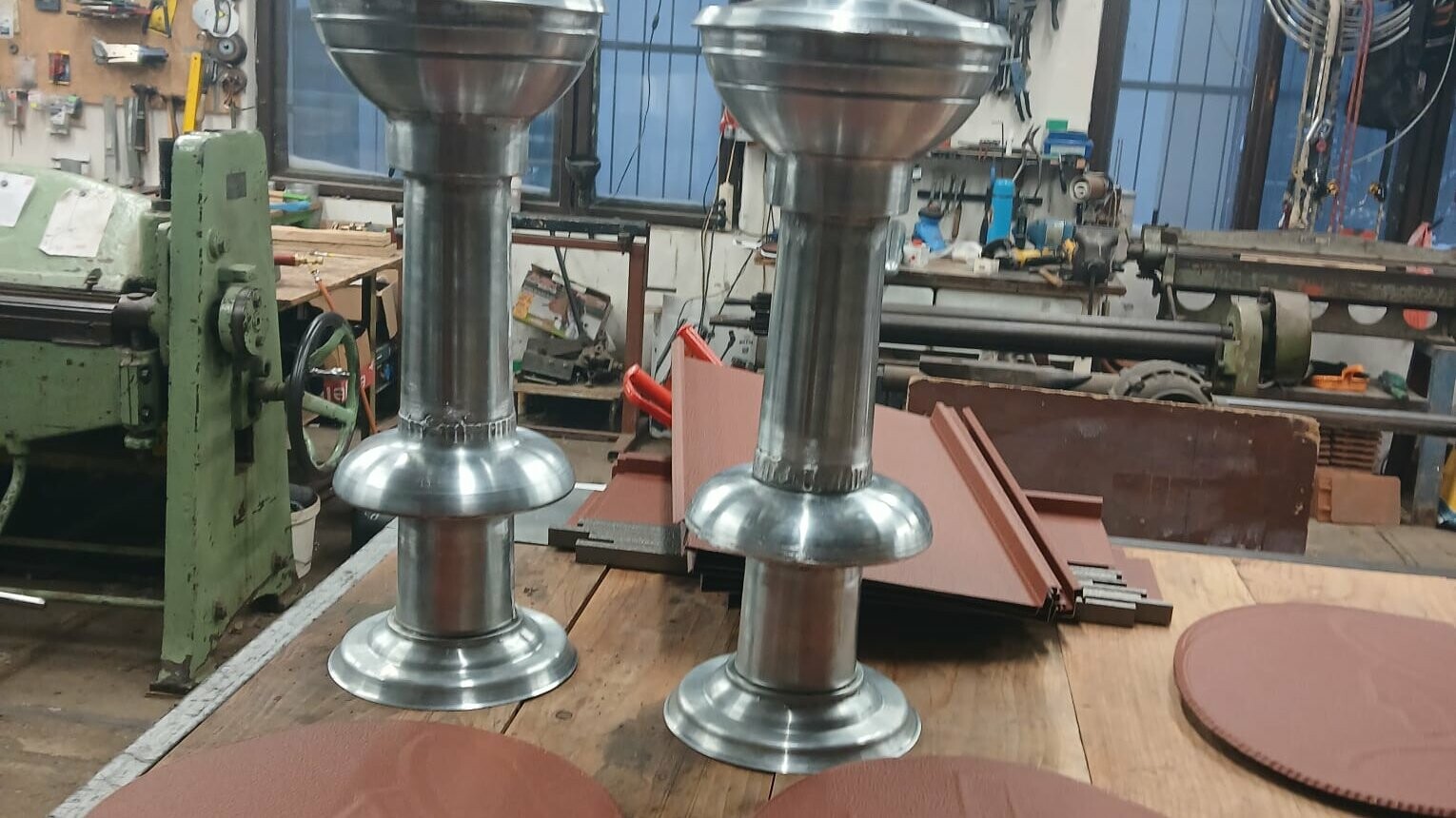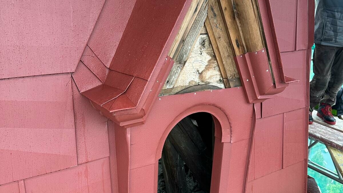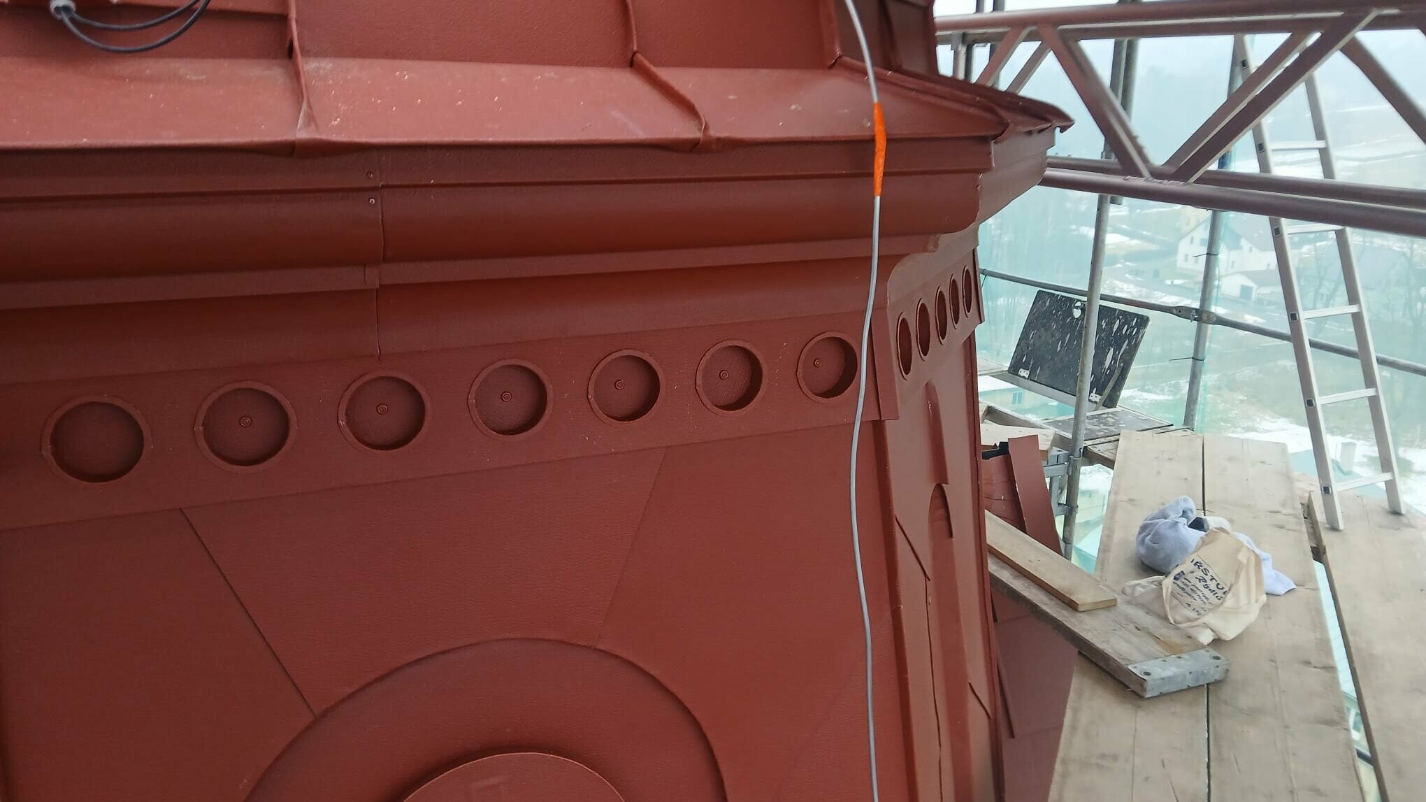 Tyto dekorativní prvky lze vidět pod ozdobnou římsou. Na fotografiích můžeme vidět přípravné zdobné mističky přímo na dílně. Následně jsou tyto prvky zafalcovány do pásů plechu, který je potom stejným způsobem vpraven jako ozdoba po obvodu věže.
