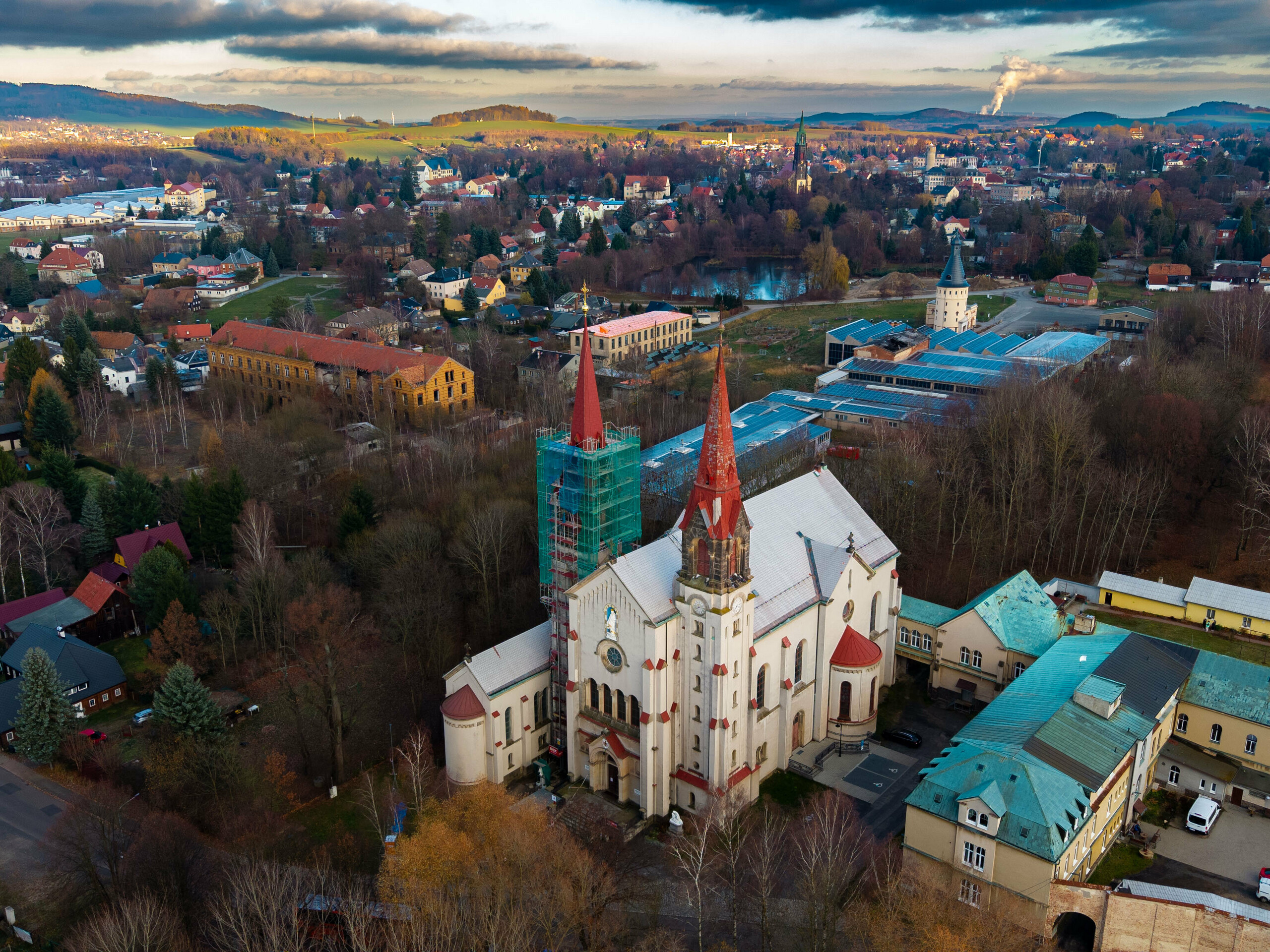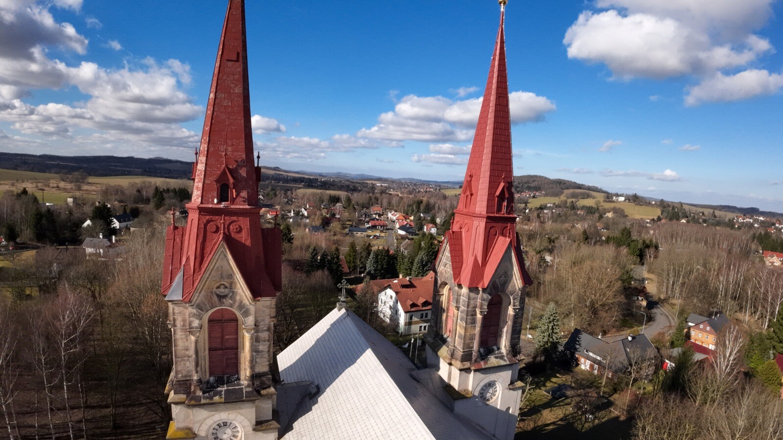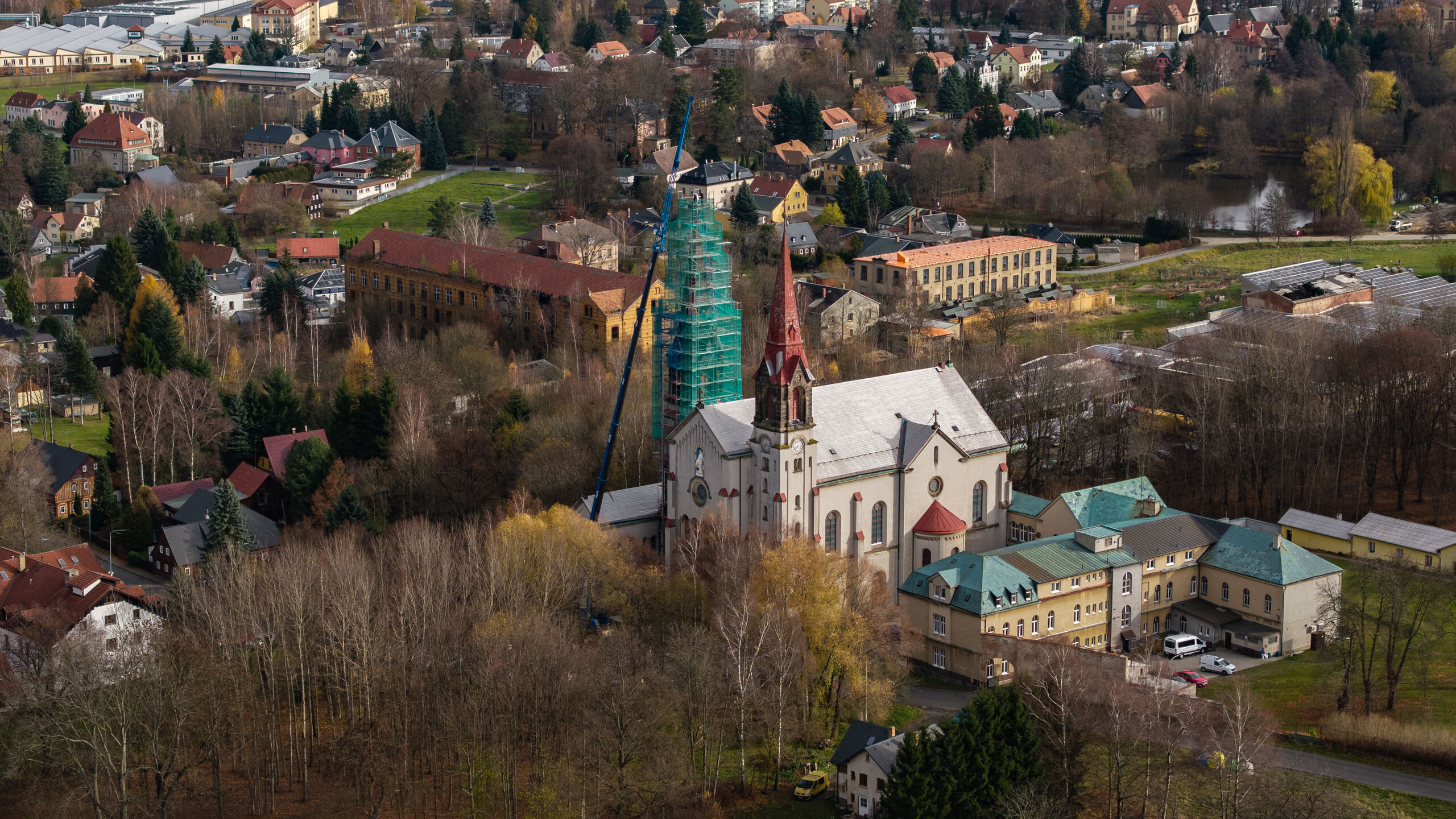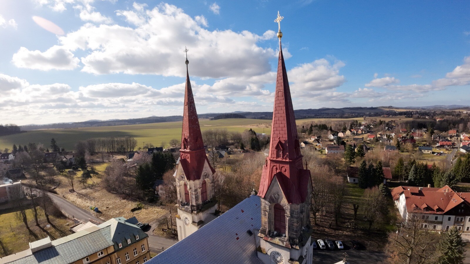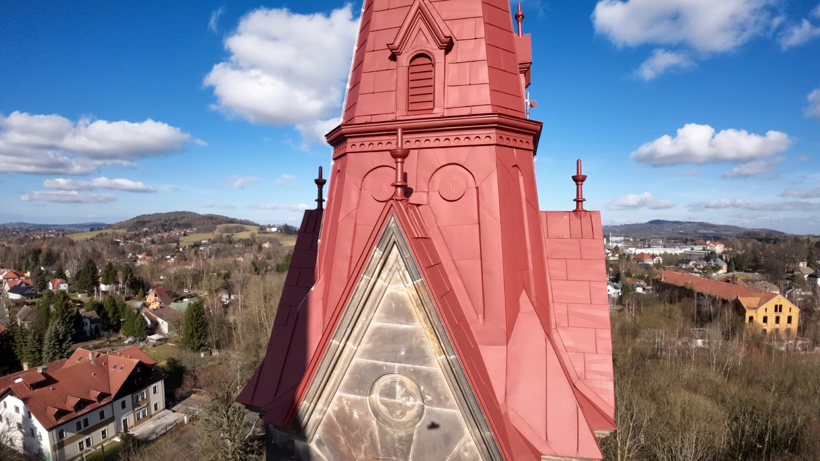 Pohled z ptačí perspektivy na věže baziliky. Díky pohledu z dronu, můžeme vidět viditelný rozdíl před a po rekonstrukci. Levá věž v původním stavu, zatímco pravá již v novém elegantním a odolném plášti ze střešního panelu FX.12 a PREFALZ v barvě P.10 tmavě červené.