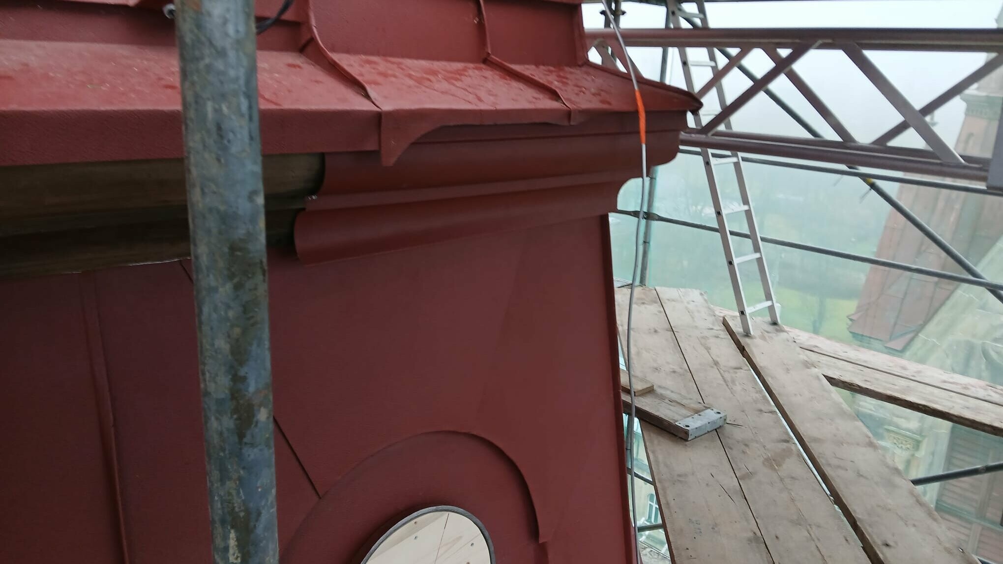 I když bylo samonosné lešení kotveno pod věž, tak zbytek lešení na věži se v poryvech větru kýval ze strany na stranu. Tato práce není pro slabé povahy a už vůbec ne pro lidi, kteří mají strach z výšek.