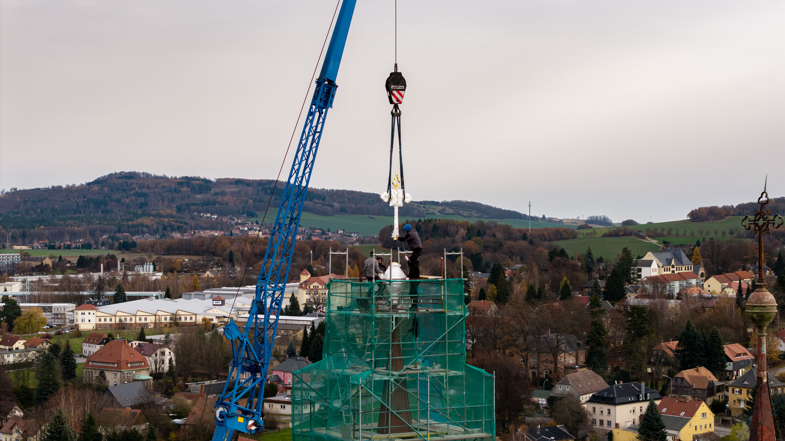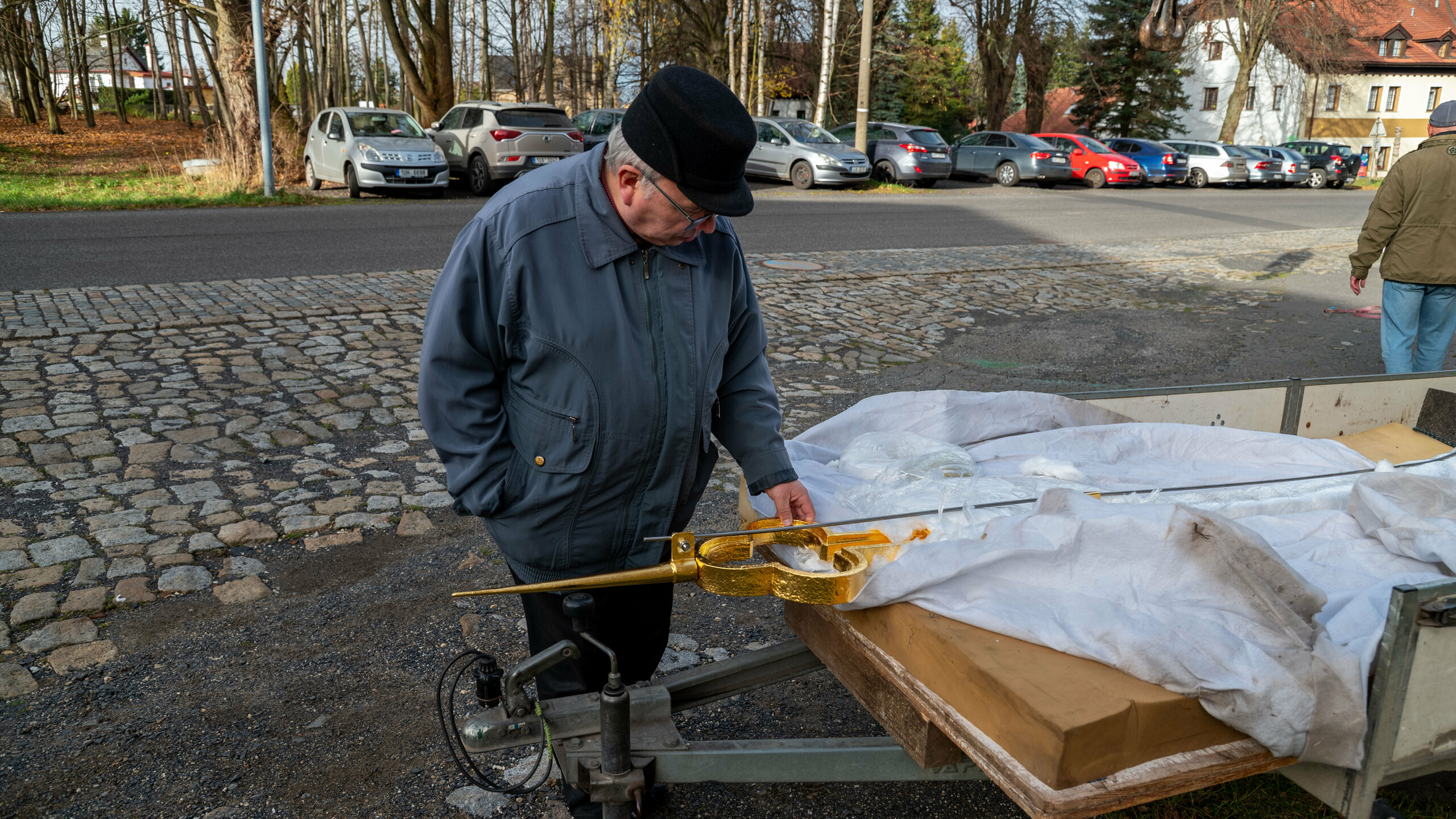 Kromě makovice byl na vrchol věže byl dopraven také mohutný kříž, který byl umístěn na makovici. Fotogalerie zachycuje dopravu a instalaci těchto umělecky zrestaurovaných sakrálních symbolů do výšky cca 60 m. Jednalo se o celkovou hmotnost cca 300 kg.